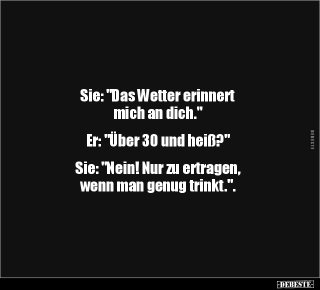 Sie: "Das Wetter erinnert mich an dich." Er: "Über 30 und heiß?" Sie: "Nein! Nur zu ertragen, wenn man genug trinkt.".