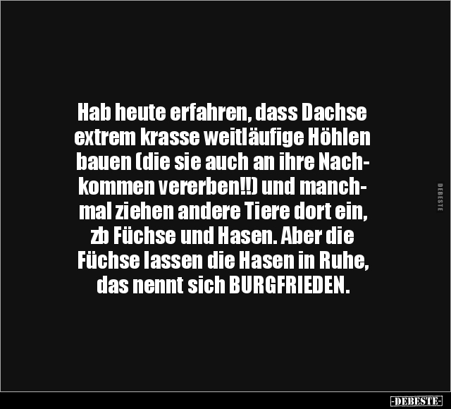Hab heute erfahren, dass Dachse extrem krasse weitläufige Höhlen bauen (die sie auch an ihre Nach- kommen vererben!!) und manch- mal ziehen andere Tiere dort ein, zb Füchse und Hasen. Aber die Füchse lassen die Hasen in Ruhe, das nennt sich BURGFRIEDEN.