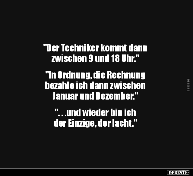 "Der Techniker kommt dann zwischen 9 und 18 Uhr." "In Ordnung, die Rechnung bezahle ich dann zwischen Januar und Dezember." ". . .und wieder bin ich der Einzige, der lacht."