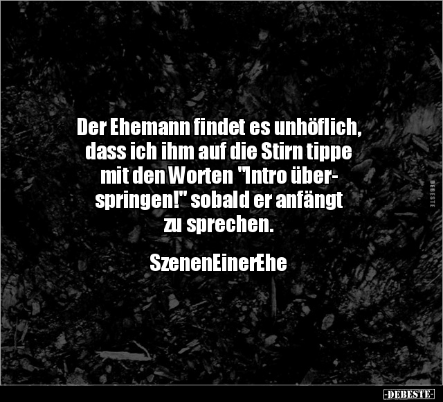 Der Ehemann findet es unhöflich, dass ich ihm auf die Stirn tippe mit den Worten "Intro über- springen!" sobald er anfängt zu sprechen. SzenenEinerEhe