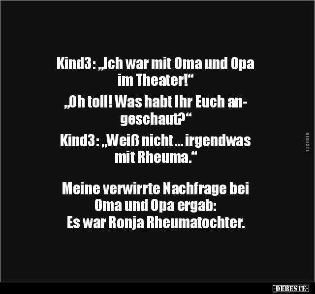 Kind3: „Ich war mit Oma und Opa im Theater!“ „Oh toll! Was habt Ihr Euch an- geschaut?“ Kind3: „Weiß nicht… irgendwas mit Rheuma.“ Meine verwirrte Nachfrage bei Oma und Opa ergab: Es war Ronja Rheumatochter.