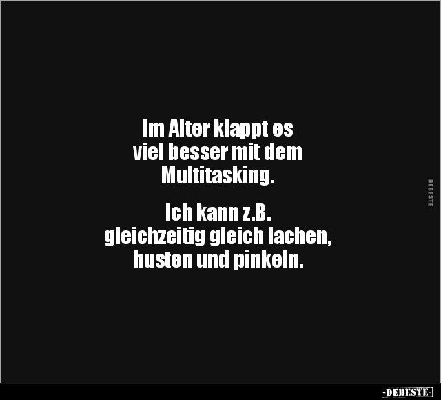 Im Alter klappt es viel besser mit dem Multitasking. Ich kann z.B. gleichzeitig gleich lachen, husten und pinkeln.