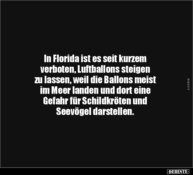 In Florida ist es seit kurzem verboten, Luftballons steigen zu lassen, weil die Ballons meist im Meer landen und dort eine Gefahr für Schildkröten und Seevögel darstellen.