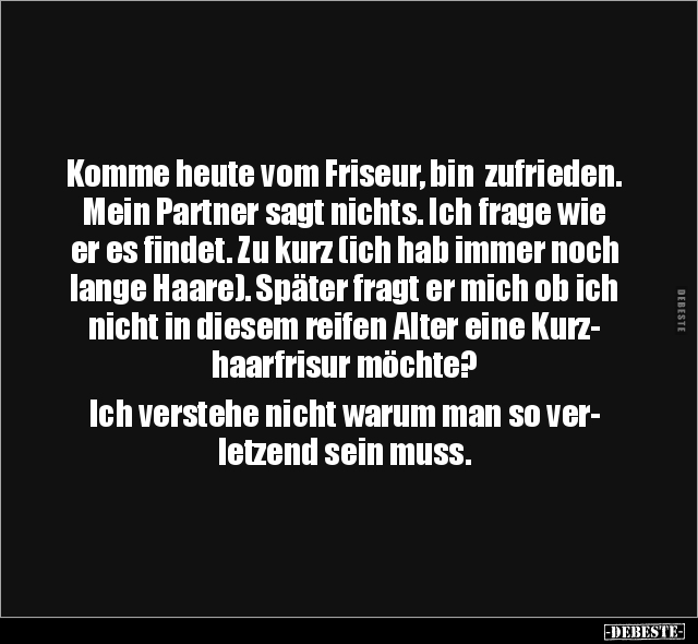 Komme heute vom Friseur, bin zufrieden. Mein Partner sagt nichts. Ich frage wie er es findet. Zu kurz (ich hab immer noch lange Haare). Später fragt er mich ob ich nicht in diesem reifen Alter eine Kurz- haarfrisur möchte? Ich verstehe nicht warum man so ver- letzend sein muss.