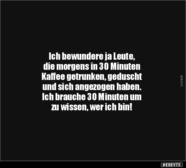 Ich bewundere ja Leute, die morgens in 30 Minuten Kaffee getrunken, geduscht und sich angezogen haben. Ich brauche 30 Minuten um zu wissen, wer ich bin!