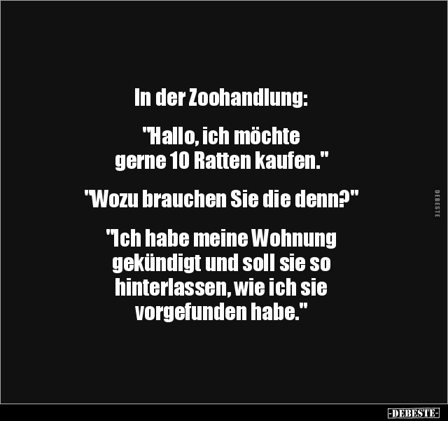 In der Zoohandlung: "Hallo, ich möchte gerne 10 Ratten kaufen." "Wozu brauchen Sie die denn?" "Ich habe meine Wohnung gekündigt und soll sie so hinterlassen, wie ich sie vorgefunden habe."