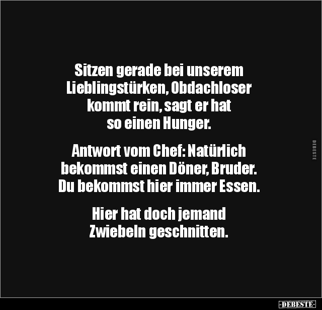 Sitzen gerade bei unserem Lieblingstürken, Obdachloser kommt rein, sagt er hat so einen Hunger. Antwort vom Chef: Natürlich bekommst einen Döner, Bruder. Du bekommst hier immer Essen. Hier hat doch jemand Zwiebeln geschnitten.