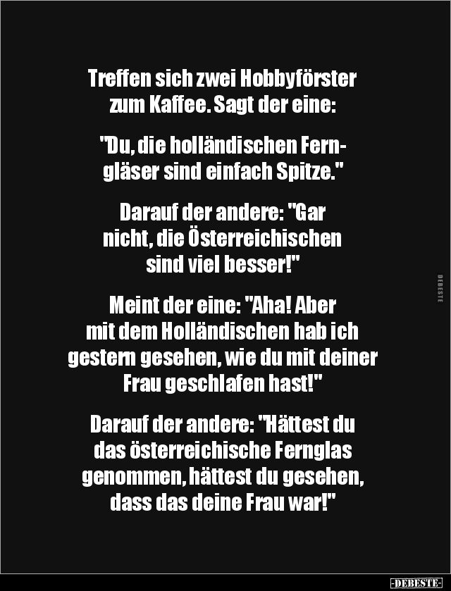 Treffen sich zwei Hobbyförster zum Kaffee. Sagt der eine: "Du, die holländischen Fern- gläser sind einfach Spitze." Darauf der andere: "Gar nicht, die Österreichischen sind viel besser!" Meint der eine: "Aha! Aber mit dem Holländischen hab ich gestern gesehen, wie du mit deiner Frau geschlafen hast!" Darauf der andere: "Hättest du das österreichische Fernglas genommen, hättest du gesehen, dass das deine Frau war!"