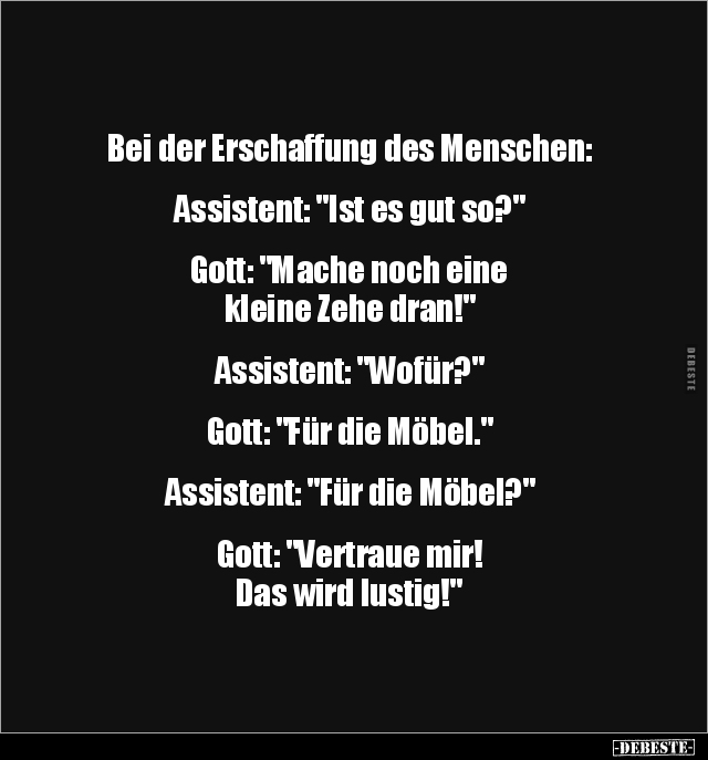 Bei der Erschaffung des Menschen: Assistent: "Ist es gut so?" Gott: "Mache noch eine kleine Zehe dran!" Assistent: "Wofür?" Gott: "Für die Möbel." Assistent: "Für die Möbel?" Gott: "Vertraue mir! Das wird lustig!"