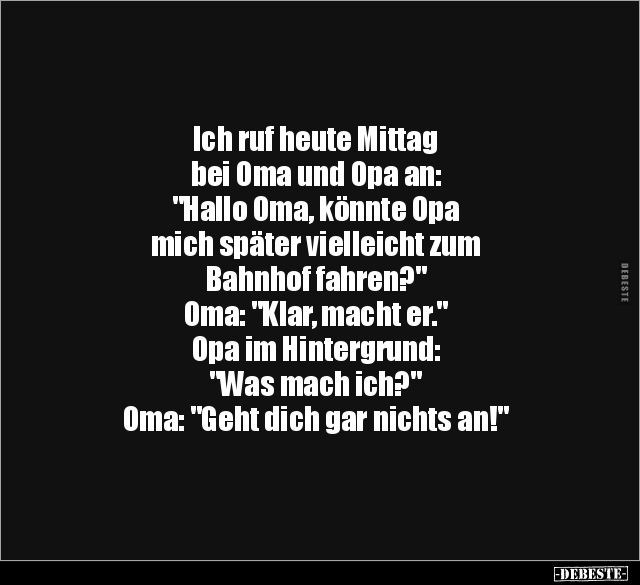 Ich ruf heute Mittag bei Oma und Opa an: "Hallo Oma, könnte Opa mich später vielleicht zum Bahnhof fahren?" Oma: "Klar, macht er." Opa im Hintergrund: "Was mach ich?" Oma: "Geht dich gar nichts an!"