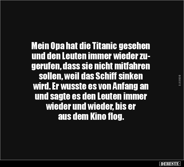 Mein Opa hat die Titanic gesehen und den Leuten immer wieder zu- gerufen, dass sie nicht mitfahren sollen, weil das Schiff sinken wird. Er wusste es von Anfang an und sagte es den Leuten immer wieder und wieder, bis er aus dem Kino flog.