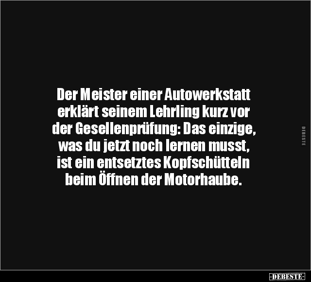 Der Meister einer Autowerkstatt erklärt seinem Lehrling kurz vor der Gesellenprüfung: Das einzige, was du jetzt noch lernen musst, ist ein entsetztes Kopfschütteln beim Öffnen der Motorhaube.