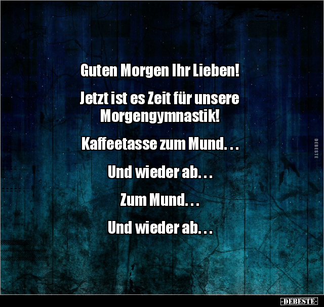 Guten Morgen Ihr Lieben! Jetzt ist es Zeit für unsere Morgengymnastik! Kaffeetasse zum Mund. . . Und wieder ab. . . Zum Mund. . . Und wieder ab. . .