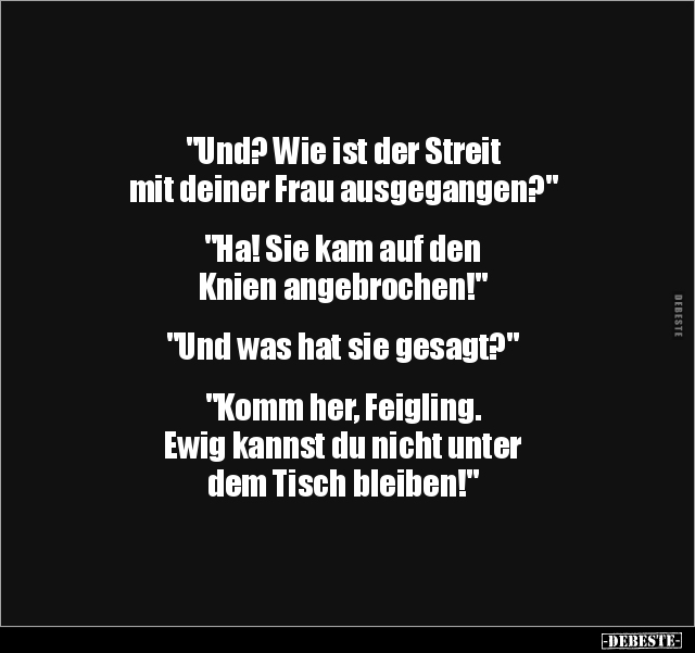 "Und? Wie ist der Streit mit deiner Frau ausgegangen?" "Ha! Sie kam auf den Knien angebrochen!" "Und was hat sie gesagt?" "Komm her, Feigling. Ewig kannst du nicht unter dem Tisch bleiben!"