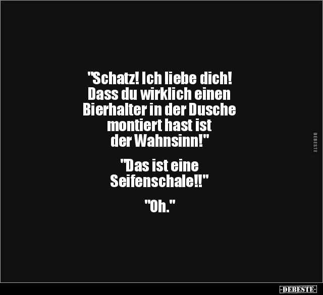 "Schatz! Ich liebe dich! Dass du wirklich einen Bierhalter in der Dusche montiert hast ist der Wahnsinn!" "Das ist eine Seifenschale!!" "Oh."