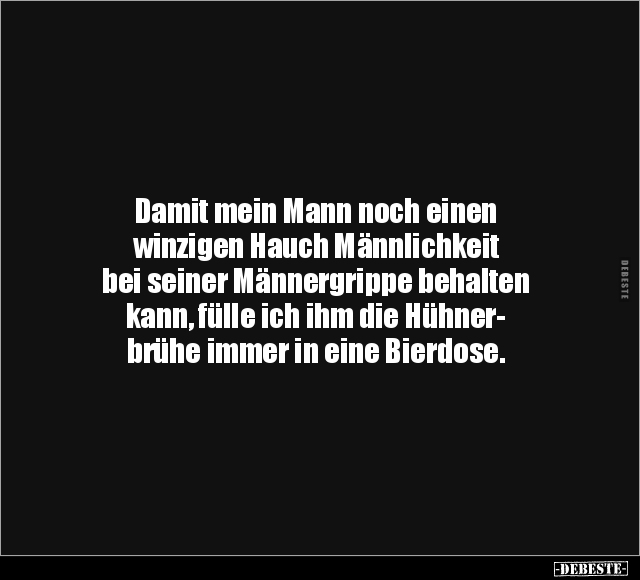 Damit mein Mann noch einen winzigen Hauch Männlichkeit bei seiner Männergrippe behalten kann, fülle ich ihm die Hühner- brühe immer in eine Bierdose.