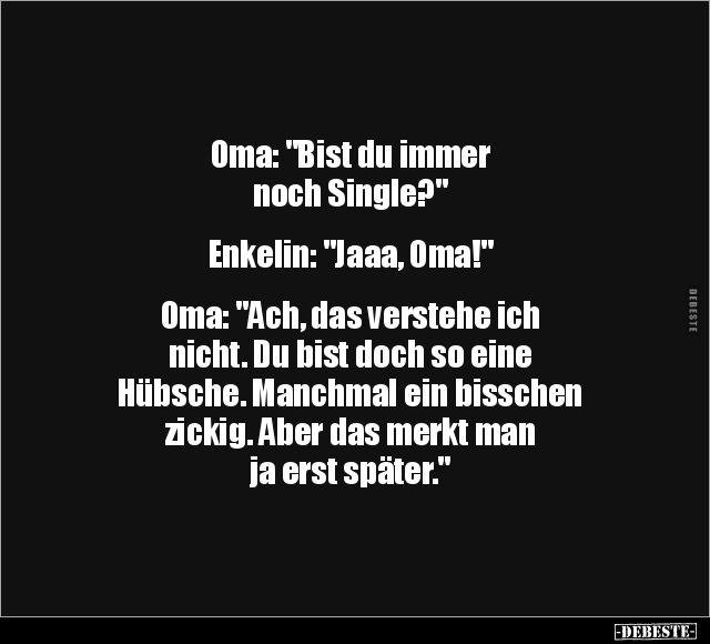 Oma: "Bist du immer noch Single?" Enkelin: "Jaaa, Oma!" Oma: "Ach, das verstehe ich nicht. Du bist doch so eine Hübsche. Manchmal ein bisschen zickig. Aber das merkt man ja erst später."