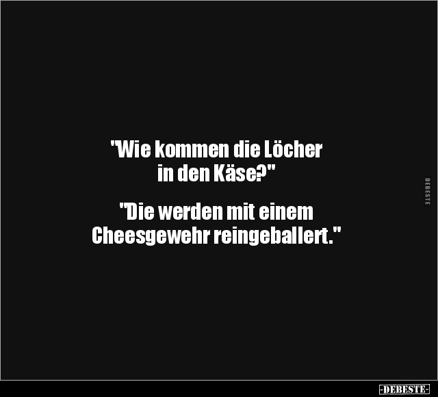 "Wie kommen die Löcher in den Käse?" "Die werden mit einem Cheesgewehr reingeballert."