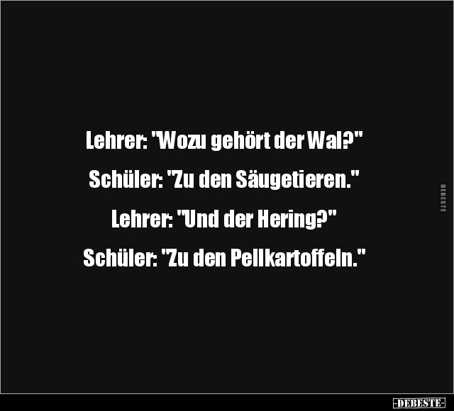 Lehrer: "Wozu gehört der Wal?" Schüler: "Zu den Säugetieren." Lehrer: "Und der Hering?" Schüler: "Zu den Pellkartoffeln."