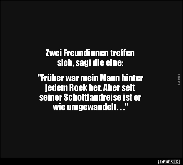 Zwei Freundinnen treffen sich, sagt die eine: "Früher war mein Mann hinter jedem Rock her. Aber seit seiner Schottlandreise ist er wie umgewandelt. . ."