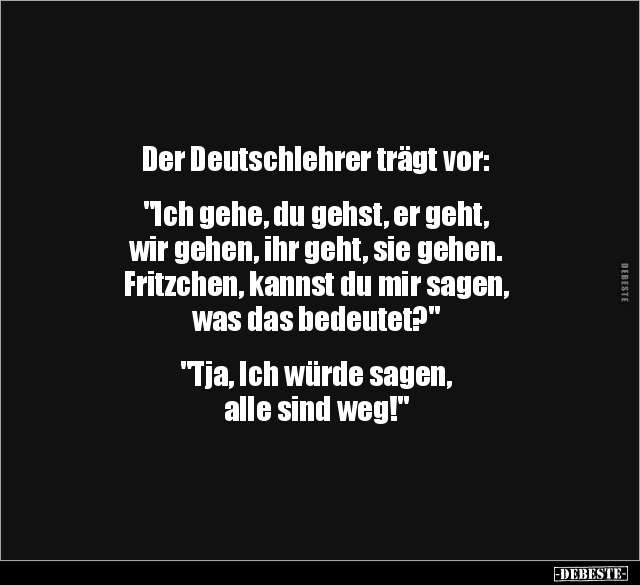 Der Deutschlehrer trägt vor: "Ich gehe, du gehst, er geht, wir gehen, ihr geht, sie gehen. Fritzchen, kannst du mir sagen, was das bedeutet?" "Tja, Ich würde sagen, alle sind weg!"