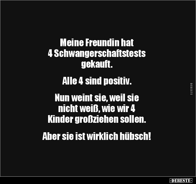 Meine Freundin hat 4 Schwangerschaftstests gekauft. Alle 4 sind positiv. Nun weint sie, weil sie nicht weiß, wie wir 4 Kinder großziehen sollen. Aber sie ist wirklich hübsch!