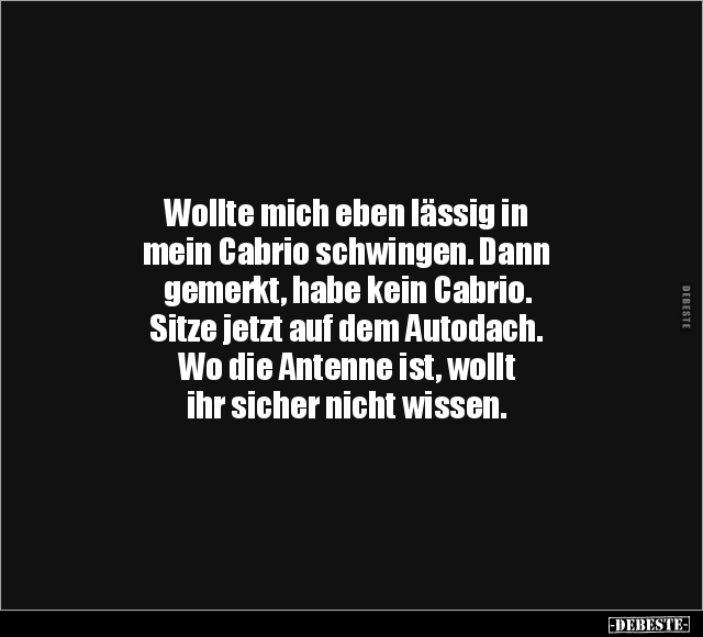 Wollte mich eben lässig in mein Cabrio schwingen. Dann gemerkt, habe kein Cabrio. Sitze jetzt auf dem Autodach. Wo die Antenne ist, wollt ihr sicher nicht wissen.