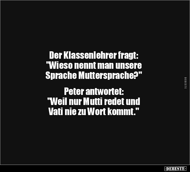 Der Klassenlehrer fragt: "Wieso nennt man unsere Sprache Muttersprache?" Peter antwortet: "Weil nur Mutti redet und Vati nie zu Wort kommt."