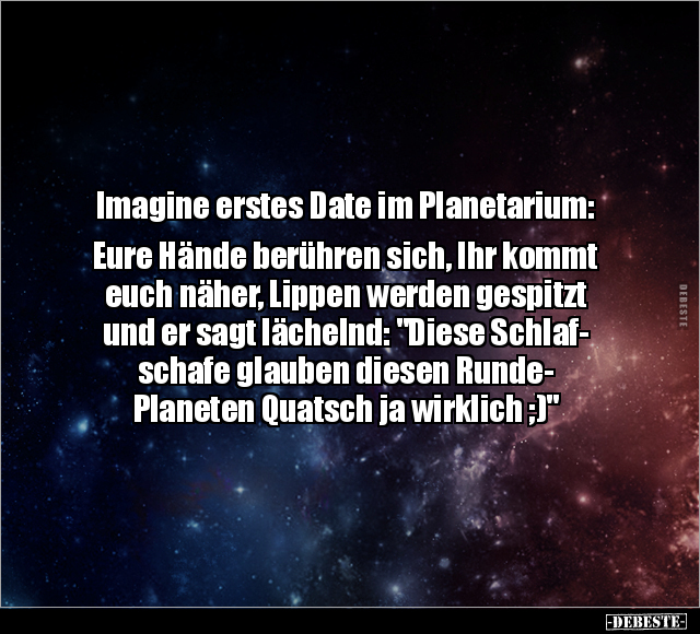 Imagine erstes Date im Planetarium: Eure Hände berühren sich, Ihr kommt euch näher, Lippen werden gespitzt und er sagt lächelnd: "Diese Schlaf- schafe glauben diesen Runde- Planeten Quatsch ja wirklich ;)"