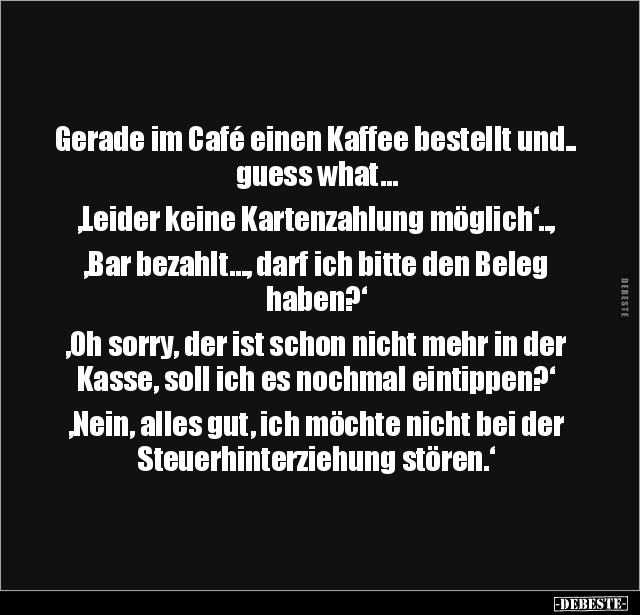 Gerade im Café einen Kaffee bestellt und.. guess what… ‚Leider keine Kartenzahlung möglich‘..‚ ‚Bar bezahlt…‚ darf ich bitte den Beleg haben?‘ ‚Oh sorry, der ist schon nicht mehr in der Kasse, soll ich es nochmal eintippen?‘ ‚Nein, alles gut, ich möchte nicht bei der Steuerhinterziehung stören.‘