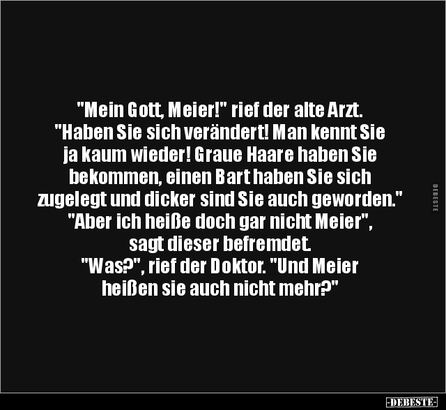 "Mein Gott, Meier!" rief der alte Arzt. "Haben Sie sich verändert! Man kennt Sie ja kaum wieder! Graue Haare haben Sie bekommen, einen Bart haben Sie sich zugelegt und dicker sind Sie auch geworden." "Aber ich heiße doch gar nicht Meier", sagt dieser befremdet. "Was?", rief der Doktor. "Und Meier heißen sie auch nicht mehr?"