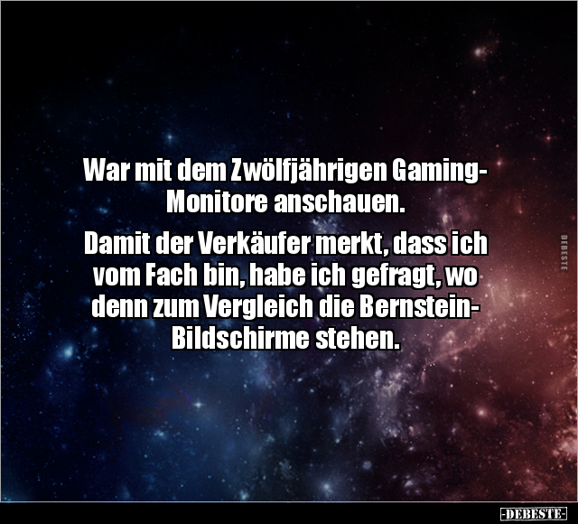 War mit dem Zwölfjährigen Gaming- Monitore anschauen. Damit der Verkäufer merkt, dass ich vom Fach bin, habe ich gefragt, wo denn zum Vergleich die Bernstein- Bildschirme stehen.