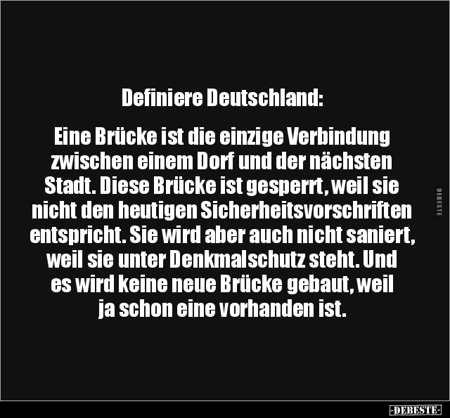 Definiere Deutschland: Eine Brücke ist die einzige Verbindung zwischen einem Dorf und der nächsten Stadt. Diese Brücke ist gesperrt, weil sie nicht den heutigen Sicherheitsvorschriften entspricht. Sie wird aber auch nicht saniert, weil sie unter Denkmalschutz steht. Und es wird keine neue Brücke gebaut, weil ja schon eine vorhanden ist.
