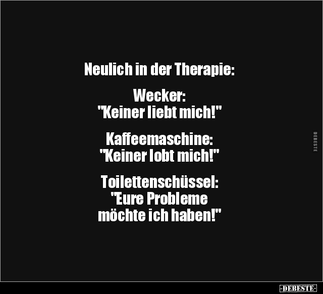 Neulich in der Therapie: Wecker: "Keiner liebt mich!" Kaffeemaschine: "Keiner lobt mich!" Toilettenschüssel: "Eure Probleme möchte ich haben!"