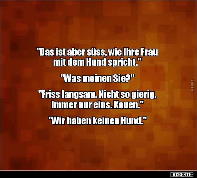"Das ist aber süss, wie Ihre Frau mit dem Hund spricht." "Was meinen Sie?" "Friss langsam. Nicht so gierig. Immer nur eins. Kauen." "Wir haben keinen Hund."