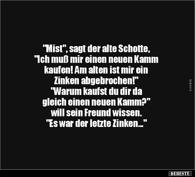 "Mist", sagt der alte Schotte, "Ich muß mir einen neuen Kamm kaufen! Am alten ist mir ein Zinken abgebrochen!" "Warum kaufst du dir da gleich einen neuen Kamm?" will sein Freund wissen. "Es war der letzte Zinken..."