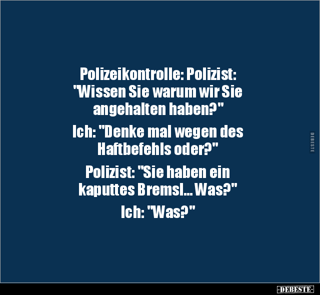 Polizeikontrolle: Polizist: "Wissen Sie warum wir Sie angehalten haben?" Ich: "Denke mal wegen des Haftbefehls oder?" Polizist: "Sie haben ein kaputtes Bremsl... Was?" Ich: "Was?"