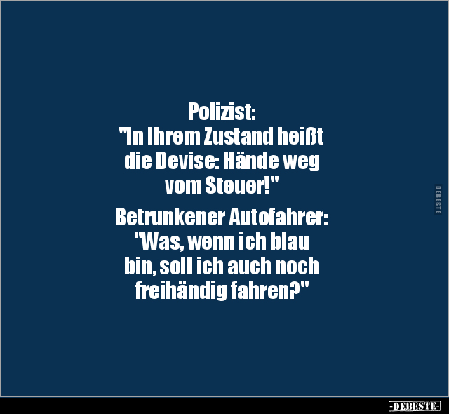 Polizist: "In Ihrem Zustand heißt die Devise: Hände weg vom Steuer!" Betrunkener Autofahrer: "Was, wenn ich blau bin, soll ich auch noch freihändig fahren?"