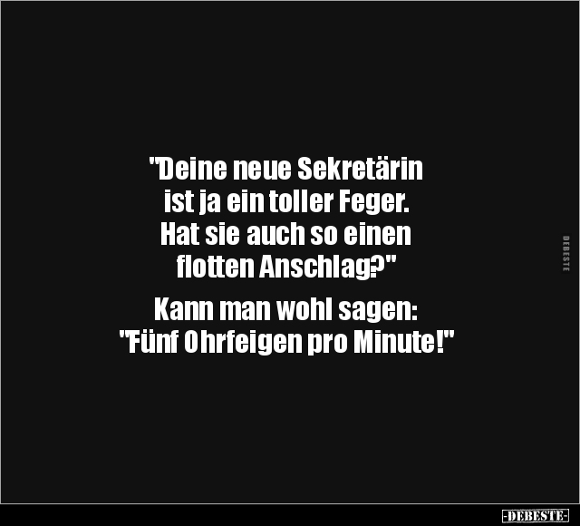 "Deine neue Sekretärin ist ja ein toller Feger. Hat sie auch so einen flotten Anschlag?" Kann man wohl sagen: "Fünf Ohrfeigen pro Minute!"