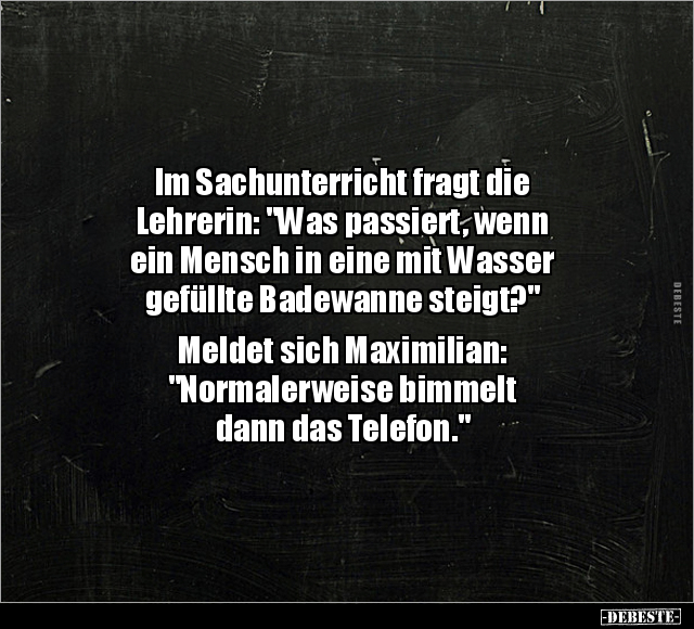 Im Sachunterricht fragt die Lehrerin: "Was passiert, wenn ein Mensch in eine mit Wasser gefüllte Badewanne steigt?" Meldet sich Maximilian: "Normalerweise bimmelt dann das Telefon."