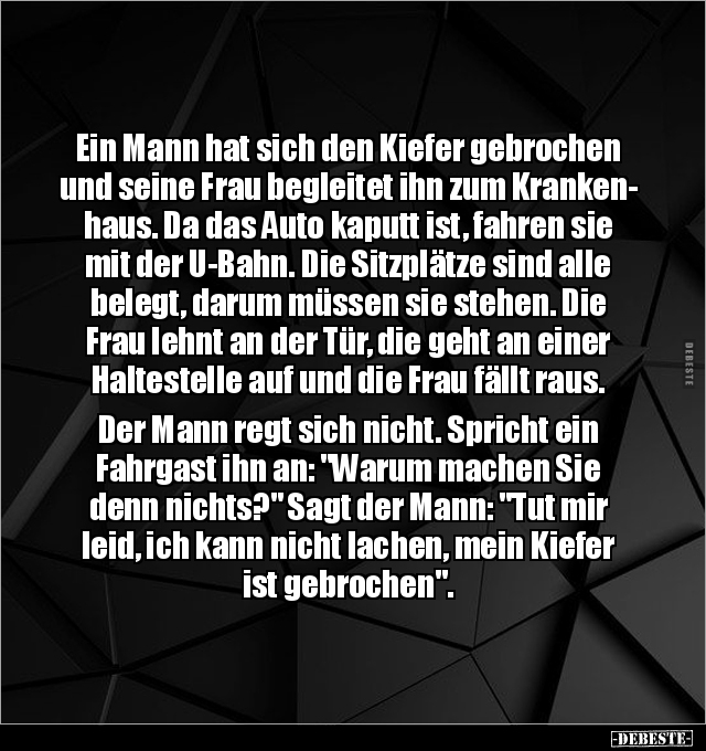 Ein Mann hat sich den Kiefer gebrochen und seine Frau begleitet ihn zum Kranken- haus. Da das Auto kaputt ist, fahren sie mit der U-Bahn. Die Sitzplätze sind alle belegt, darum müssen sie stehen. Die Frau lehnt an der Tür, die geht an einer Haltestelle auf und die Frau fällt raus. Der Mann regt sich nicht. Spricht ein Fahrgast ihn an: "Warum machen Sie denn nichts?" Sagt der Mann: "Tut mir leid, ich kann nicht lachen, mein Kiefer ist gebrochen".