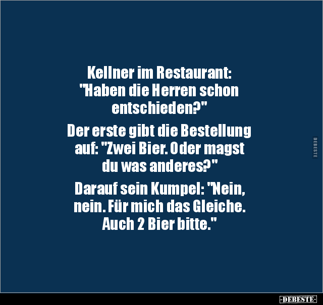 Kellner im Restaurant: "Haben die Herren schon entschieden?" Der erste gibt die Bestellung auf: "Zwei Bier. Oder magst du was anderes?" Darauf sein Kumpel: "Nein, nein. Für mich das Gleiche. Auch 2 Bier bitte."
