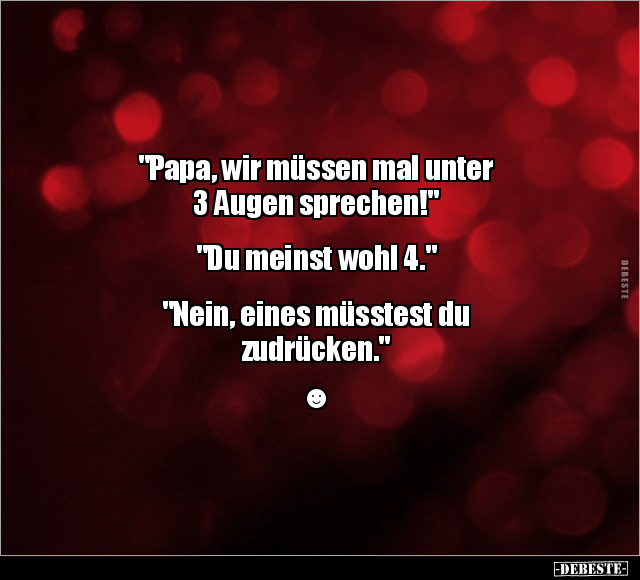 "Papa, wir müssen mal unter 3 Augen sprechen!" "Du meinst wohl 4." "Nein, eines müsstest du zudrücken." ☻
