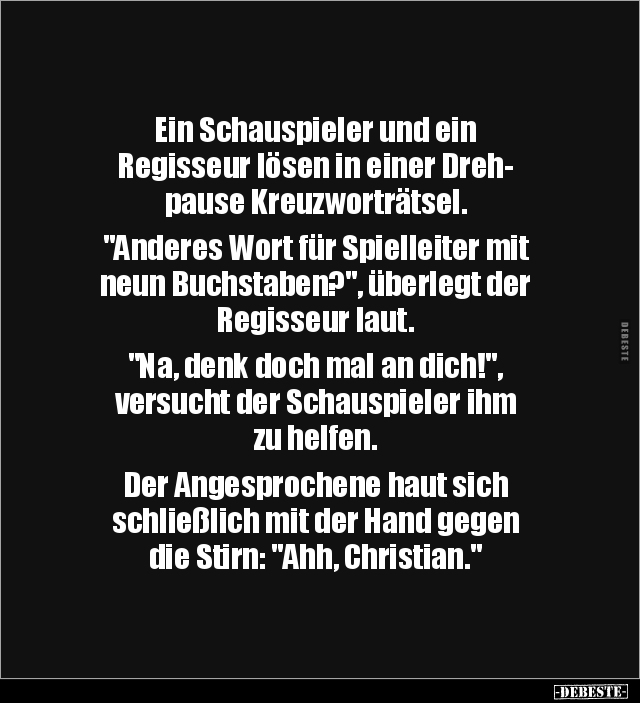 Ein Schauspieler und ein Regisseur lösen in einer Dreh- pause Kreuzworträtsel. "Anderes Wort für Spielleiter mit neun Buchstaben?", überlegt der Regisseur laut. "Na, denk doch mal an dich!", versucht der Schauspieler ihm zu helfen. Der Angesprochene haut sich schließlich mit der Hand gegen die Stirn: "Ahh, Christian."