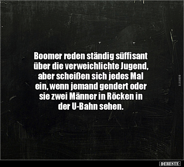 Boomer reden ständig süffisant über die verweichlichte Jugend, aber scheißen sich jedes Mal ein, wenn jemand gendert oder sie zwei Männer in Röcken in der U-Bahn sehen.