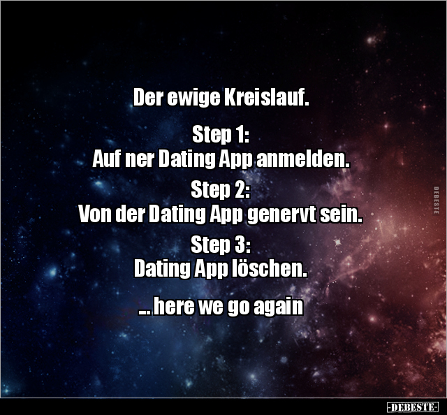 Der ewige Kreislauf. Step 1: Auf ner Dating App anmelden. Step 2: Von der Dating App genervt sein. Step 3: Dating App löschen. ... here we go again