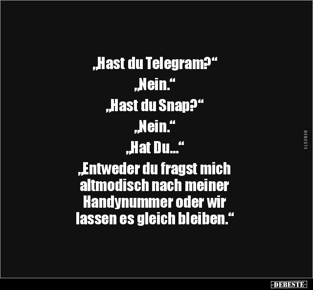 „Hast du Telegram?“ „Nein.“ „Hast du Snap?“ „Nein.“ „Hat Du…“ „Entweder du fragst mich altmodisch nach meiner Handynummer oder wir lassen es gleich bleiben.“