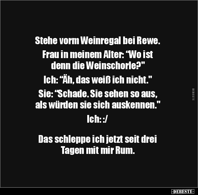 Stehe vorm Weinregal bei Rewe. Frau in meinem Alter: “Wo ist denn die Weinschorle?" Ich: “Äh, das weiß ich nicht." Sie: “Schade. Sie sehen so aus, als würden sie sich auskennen." Ich: :/ Das schleppe ich jetzt seit drei Tagen mit mir Rum.