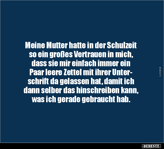 Meine Mutter hatte in der Schulzeit so ein großes Vertrauen in mich, dass sie mir einfach immer ein Paar leere Zettel mit ihrer Unter- schrift da gelassen hat, damit ich dann selber das hinschreiben kann, was ich gerade gebraucht hab.