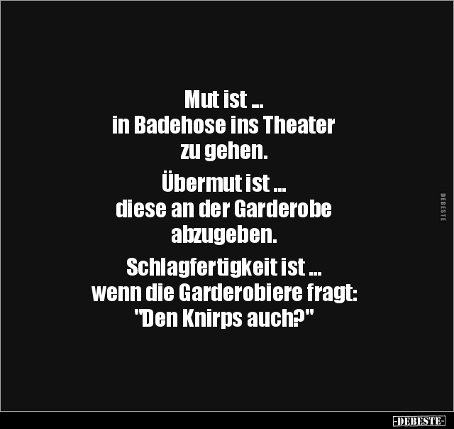 Mut ist ... in Badehose ins Theater zu gehen. Übermut ist ... diese an der Garderobe abzugeben. Schlagfertigkeit ist ... wenn die Garderobiere fragt: "Den Knirps auch?"